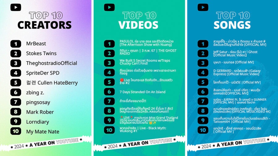 - วิดีโอยอดนิยมบน YouTube หมวดทั่วไป: พิจารณาจากยอดดูภายในประเทศของวิดีโอที่อัปโหลดในปี 2567 ยกเว้น วิดีโอ Shorts มิวสิควิดีโอ วิดีโอตัวอย่าง และวิดีโอสำหรับเด็ก (1 วิดีโอ ต่อ 1 ครีเอเตอร์)