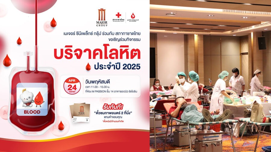 เมเจอร์ ซีนีเพล็กซ์ กรุ้ป ร่วมกับ ศูนย์บริการโลหิตแห่งชาติ สภากาชาดไทย เชิญชวนพนักงาน ผู้ประกอบการร้านค้า ลูกค้า และประชาชนทั่วไป มาร่วมกันทำบุญใหญ่ต้อนรับปีใหม่ไทยด้วยการบริจาคโลหิต โดยเปิดจุดรับบริจาคโลหิตในวันที่ 24 เมษายน 2568 ตั้งแต่เวลา 11.00 –15.00 น. ณ ห้อง M Passion ชั้น 14 อาคารอเวนิว เมเจอร์ ซีนีเพล็กซ์ รัชโยธิน เพื่อสำรองโลหิตให้มีปริมาณเพียงพอในช่วงวันหยุดเทศกาล ซึ่งโรงพยาบาลต่าง ๆ จะต้องใช้ปริมาณโลหิตเป็นจำนวนมากให้กับผู้ที่ประสบอุบัติเหตุต้องการเลือดในช่วงเทศกาลสงกรานต์เป็นจำนวนมากในทุกปี สำหรับกิจกรรมนี้เป็นการเล็งเห็นถึงสถานการณ์การขาดแคลนโลหิตสำรองจึงร่วมรณรงค์ให้มีการบริจาคโลหิตอย่างสม่ำเสมอทุก 3 เดือน