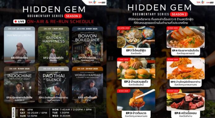 การกลับมาอีกครั้งของภาพยนตร์สารคดีซีรีส์สัญชาติไทยที่ดังไกลไปทั่วโลก “Hidden Gem ซีซั่น 2” จาก ทรูซีเจ ครีเอชั่นส์ ที่จะพาผู้ชมไปสัมผัสเรื่องราวสุดพิเศษที่เปรียบเหมือน “อัญมณีล้ำค่าที่ซ่อนอยู่ในรสชาติ” จากเจ้าของร้านสตรีทฟู้ดทั่วทุกมุมของประเทศไทย เปิดประสบการณ์การค้นพบที่จะพาคุณตื่นตาตื่นใจไปกับวัฒนธรรมอันหลากหลายและขนบธรรมเนียมอันงดงามของแต่ละท้องถิ่น ออกอากาศตอนแรกในวันที่ 24 เมษายน 2568 เวลา 20.00 น. ทาง Asian Food Network ทรูวิชั่นส์ ช่อง 356, True Visions NOW, TrueID, และรับชมย้อนหลังได้ทาง MAX สำหรับทาง Netflix เริ่มรับชมได้ตั้งแต่วันที่ 5 มิถุนายน 2568 เป็นต้นไป