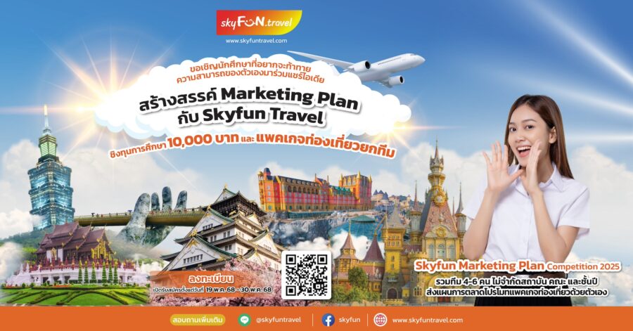 สกายฟันทราเวล ในเครือสายการบินเวียตเจ็ทไทยแลนด์ ผู้ให้บริการแพลตฟอร์มจำหน่ายสินค้าและบริการท่องเที่ยวผ่านเว็บไซต์ www.skyfuntravel.com จัดกิจกรรมประกวดแผนการตลาดส่งเสริมการขายแพ็คเกจท่องเที่ยว เชิญชวนนิสิตนักศึกษาระดับปริญญาตรีทุกสาขาวิชา ไม่จำกัดสถาบันการศึกษาและชั้นปี รวมทีมตั้งแต่ 4 – 6 คน เข้าร่วมประชันไอเดียเพื่อชิงทุนการศึกษา มูลค่า 10,000 บาท พร้อมแพ็คเกจท่องเที่ยวเส้นทางในฝันโดยไม่มีค่าใช้จ่าย