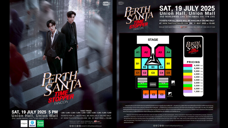 สำหรับผู้ที่สนใจเข้าร่วมงาน “PERTH SANTA TIME STOPPER FANCON” สามารถจับจองบัตรบนช่องทาง Online ในวันเสาร์ที่ 31 พฤษภาคมนี้ เริ่มเวลา 10:00 น. เป็นต้นไป เปิดจำหน่ายทุกที่นั่ง ทางออนไลน์ที่ www.thaiticketmajor.com เท่านั้น และเปิดจำหน่ายบัตร ทุกช่องทางตามปกติ ในวันอาทิตย์ที่ 1 มิถุนายนนี้ เริ่มเวลา 10:00 น. เป็นต้นไป ทางไทยทิคเก็ตเมเจอร์ทุกสาขา, www.thaiticketmajor.com และ Call center โทร 0-2262-3456 บัตรราคา 6,500 / 6,000 / 5,000 / 4,500 / 4,000 / 3,500 / 3,000 / 2,500 / 2,000 / 1,500 บาท และดูสดผ่าน TTM LIVE บัตรราคา 1,500 / 1,200 บาท (ลิ้งค์และโค้ดรับชม) กรณีต้องการบัตรพลาสติกที่ระลึกชำระเพิ่ม 30 บาทต่อใบ ติดตามรายละเอียดเพิ่มเติมได้ที่เว็บไซต์ : www.thaiticketmajor.com Facebook : www.facebook.com/gmmtvofficial และ Instagram & X & TikTok & YouTube & Weibo : GMMTV
