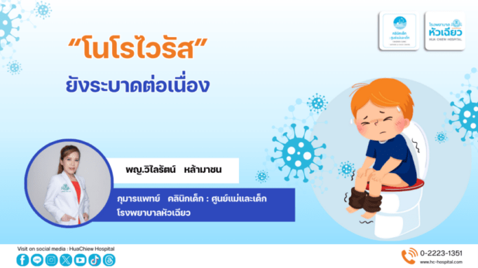 พญ.วิไลรัตน์ หล้ามาชน กุมารแพทย์ คลินิกเด็ก โรงพยาบาลหัวเฉียว กล่าวว่า โนโรไวรัส (Norovirus) มีชื่อเดิมว่า Norwalk Virus สามารถติดต่อได้หลายทาง เช่น การรับประทานอาหารหรือดื่มน้ำที่มีเชื้อไวรัสปนเปื้อน โดยเฉพาะอาหารที่ปรุงไม่สุก เช่น หอย ผักผลไม้สดที่ล้างไม่สะอาด รวมถึงการสัมผัสกับผู้ป่วยโดยตรง การจับหรือสัมผัสกับสิ่งของที่มีเชื้ออยู่แล้วนำนิ้วเข้าปากโดยเฉพาะในเด็ก จึงมักพบการระบาดอย่างรวดเร็วในโรงเรียนอนุบาล และโรงเรียนประถม เมื่อเชื้อเข้าสู่ร่างกายเชื้อจะอาศัยอยู่บริเวณลำไส้เล็กส่วนต้น ภายใน 12-48 ชั่วโมงหลังรับเชื้อนี้ ทำให้เกิดความผิดปกติของการดูดซึมไขมันและน้ำตาลของลำไส้เล็ก เกิดการถ่ายอุจจาระเป็นน้ำ คลื่นไส้ อาเจียน ปวดท้อง อาการอื่นๆ ที่อาจพบได้ เช่น มีไข้ต่ำๆ ปวดศีรษะ ปวดเมื่อยกล้ามเนื้อ อ่อนเพลีย สำหรับรายที่มีอาการอาเจียนและถ่ายเป็นน้ำปริมาณมาก อาจทำให้ผู้ป่วยมีอาการขาดน้ำ เช่น อ่อนเพลียมาก มีชีพจรเบาแต่เร็ว และมีความดันโลหิตต่ำได้