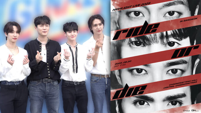 เตรียมพบกับคอนเสิร์ตเต็มรูปแบบ “HIGHLIGHT LIVE 2025 [RIDE OR DIE] IN BANGKOK” ในวันเสาร์ที่ 20 กันยายน 2568 ณ แจ้งวัฒนะฮอลล์ เซ็นทรัลพลาซ่า แจ้งวัฒนะ โดยผู้จัด O.N worldwide ที่เตรียมขนทุกพลังความมันส์ ความอบอุ่น และโมเมนต์แห่งความประทับใจมาให้แบบจัดเต็ม
