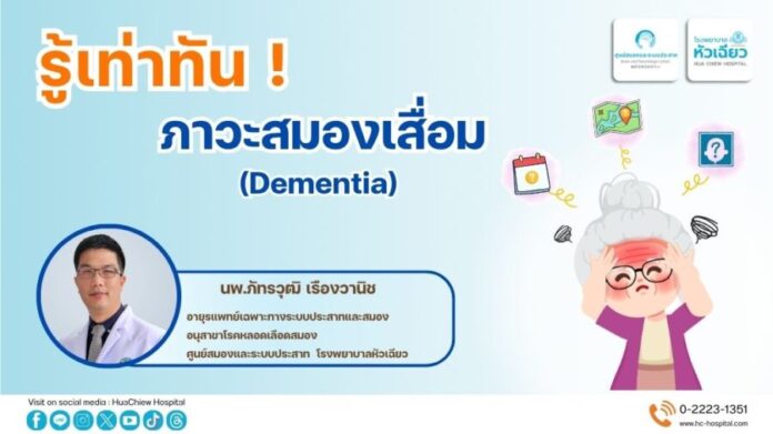 นพ.ภัทรวุฒิ เรืองวานิช อายุรแพทย์เฉพาะทางระบบประสาทและสมอง อนุสาขาโรคหลอดเลือดสมอง ศูนย์สมองและระบบประสาท โรงพยาบาลหัวเฉียว กล่าวว่า หากคุณมีความถดถอยบกพร่องในเรื่องความจำ การตัดสินใจ การวางแผน การรับรู้ด้านมิติสัมพันธ์ การใช้ภาษา สมาธิหรือความใส่ใจ ความสามารถในการรับรู้ การเข้าสังคมเปลี่ยนไปจากเดิม อาการเหล่านี้อาจเป็นสัญญาณแสดงของภาวะสมองเสื่อมได้ แบ่งเป็น 2 กลุ่มหลัก คือ 1.ภาวะสมองเสื่อมที่ยังไม่ทราบสาเหตุแน่ชัด ได้แก่ โรคอัลไซเมอร์ และ 2.ภาวะสมองเสื่อมที่เกิดจากโรคที่รักษาได้ เช่น โรคเนื้องอกในสมอง ภาวะน้ำคั่งในโพรงสมอง ภาวะขาดสารอาหารบางชนิด เช่น วิตามิน B วิตามิน B12 หรือ กรดโฟลิก ภาวะโรคโลหิตจาง ภาวะการติดเชื้อบางชนิด เช่น HIV ซิฟิลิสในสมอง ระดับไทรอยด์ฮอร์โมนผิดปกติ ภาวะหยุดหายใจขณะนอนหลับ