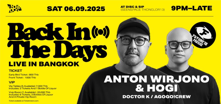 สองสุดยอดดีเจจากจาการ์ตา Anton Wirjono และ Hogi จะมามอบประสบการณ์ทางเสียงที่น่าจดจำ ครั้งแรกในกรุงเทพฯ กับ “Back In The Days in Live In Bangkok!”