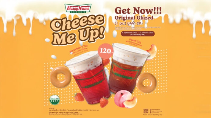 คริสปี้ ครีม ประเทศไทย เอาใจคนรักครีมชีสด้วยความอร่อยแบบพรีเมียมของ Krispy Kreme Cheese Me Up! ที่ผสานความหอมหวานของชาผลไม้เข้ากับความนุ่มละมุนของครีมชีสอย่างลงตัวกับ 2 เมนูยอดนิยม ทั้ง “ชาสตรอว์เบอร์รี ครีมชีส” (Strawberry Tea with Cream Cheese) และ “ชาพีช ครีมชีส” (Peach Tea with Cream Cheese) ในขนาด 16 Oz ราคาแก้วละ 110 บาท