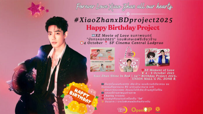 XZ Moment of Love จัดขึ้นระหว่างวันที่ 4-9 ตุลาคมนี้ ภายใต้ชื่องาน Xiao Zhan Shine In Red | 34ᵀᴴ Birthday Project 2025 ที่ ศูนย์การค้ายูเนียน มอลล์ โซน B ที่จะให้ FC ของเซียวจ้านได้มาเก็บทุกโมเมนต์เพื่อบอกรัก เซียวจ้าน แบบอีเวนต์เดียวครบจบทุกกิจกรรมอาทิ เขียนการ์ดอวยพรให้เซียวจ้าน โดยหลังจบงานทางผู้จัดจะดำเนินการส่งมอบไปให้กับเซียวจ้านสตูดิโอที่จีน, ร่วมเก็บภาพสวยๆ ที่มุมถ่ายภาพแกลลอรี่, Charity การกุศลร่วมสนุกไปกับแบรนด์เครื่องดื่ม “อีฟ” พร้อมจับฉลากลุ้นรางวัลพิเศษผลิตภัณฑ์จากจีน และตบท้ายกับการสั่งจองของที่ระลึกสุดพิเศษที่โซน VIP