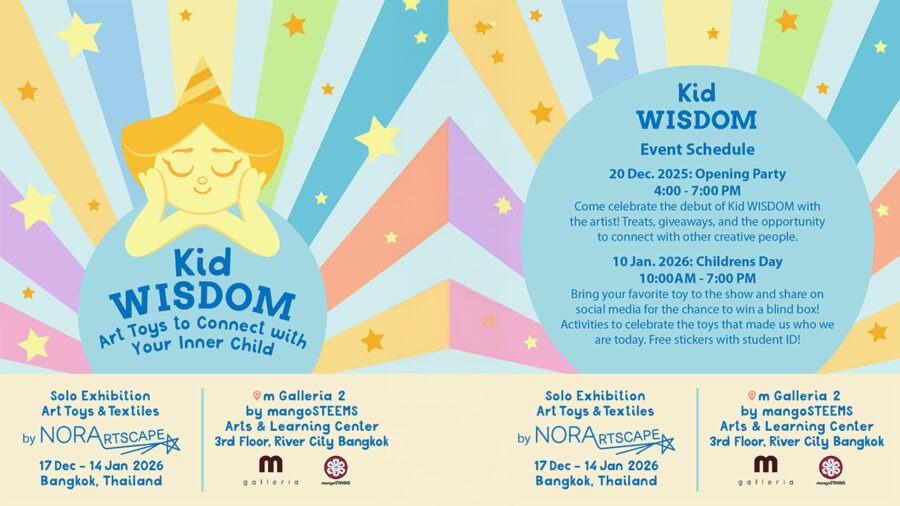 mangoSTEEMS Arts & Learning Center ยินดีอย่างยิ่งที่จะประกาศจัดงาน “Kid Wisdom: Art Toys to Connect with Your Inner Child” อาร์ตทอยที่จะเชื่อมโยงกับความเป็นเด็กในตัวคุณ นิทรรศการเดี่ยวครั้งแรกของ NORArtscape ศิลปินชาวอาร์เมเนียน-อเมริกันผู้ได้รับการยกย่อง โดยจะจัดแสดงตั้งแต่วันที่ 17 ธันวาคม 2568 ถึง 14 มกราคม 2569 นิทรรศการนี้จะเป็นการเปิดตัวคอลเลกชันอาร์ตทอยชุดแรกของศิลปินอย่างเป็นทางการ ซึ่งจัดแสดงควบคู่ไปกับผลงานศิลปะร่วมสมัยที่น่าสนใจในรูปแบบสิ่งทอ