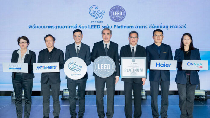 อาคาร ซีดับเบิ้ลยู ทาวเวอร์ นำโดย นายพงษ์ศักดิ์ นันตวรรณกุล (กลาง) กรรมการผู้จัดการ และ นายนักรบ กุลพนิชย์ (ที่ 3 จากขวา) ผู้จัดการทั่วไป ได้รับการรับรองมาตรฐานอาคารสีเขียวระดับสูงสุด LEED Platinum ประเภท O+M (Operation & Maintenance) ภายใต้มาตรฐานจาก U.S. Green Building Council ตอกย้ำการดำเนินงานของอาคารที่มุ่งมั่นด้านความยั่งยืนและการดูแลรักษาสิ่งแวดล้อมมาอย่างต่อเนื่อง จนสามารถดำเนินการออกมาเป็นรูปธรรมจับต้องได้ผ่านเทคโนโลยี การบริหารจัดการพลังงาน และโครงการด้านสิ่งแวดล้อมที่ต่อเนื่องยาวนาน เดินหน้าสู่เป้าหมาย Net Zero โดยมี นางอุภาสศรี บำรุงวงศ์ (ขวา) และ มร.นายต่ง เจี้ยนผิง (ที่ 2 จากขวา) พันธมิตรผู้เช่าอาคารร่วมแสดงความยินดี เมื่อเร็ว ๆ นี้