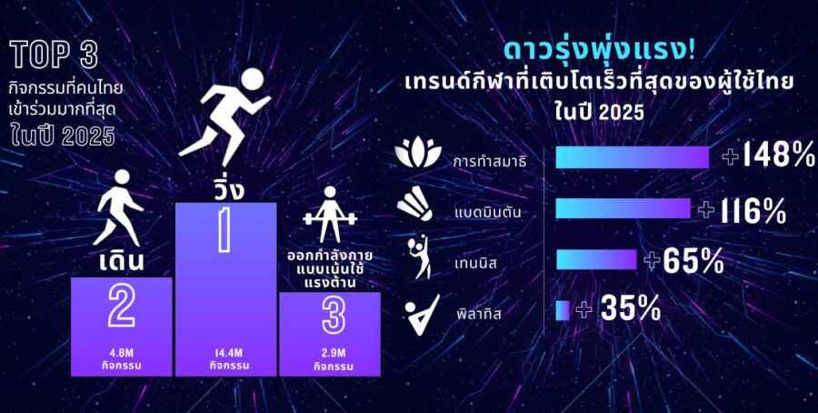 กความแข็งแรงของกล้ามเนื้อทั่ วโลกเพิ่มขึ้น 29% ข้อมูลอินไซด์ระบุว่า ผู้หญิงมีจำนวนครั้งการฝึ กความแข็งแรงของกล้ามเนื้ อมากกว่าผู้ชายถึง 6% สำหรับภูมิภาคเอเชีย การฝึกความแข็งแรงของกล้ามเนื้ อเติบโต 27% โดยประเทศไทยเติบโตสูงถึง 30% แซงการปั่นจักรยานเป็นครั้งแรก และก้าวขึ้นมาติดอันดับ 3 กีฬายอดนิยม ซึ่งสะท้อนการเปลี่ยนแปลงพฤติ กรรมการออกกำลังกายของผู้คนไปสู่ รูปแบบที่สมดุลมากขึ้น - กีฬาประเภทแร็กเก็ต (Racket Sports): ประกอบด้วยพิกเคิลบอล แบดมินตัน ปิงปอง และพาเดล มียอดการทำกิจกรรมทั่วโลกเพิ่