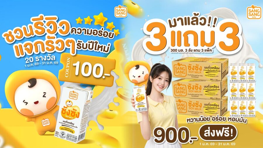 เริ่มต้นปีแบบปัง ๆ กับนมถั่วเหลืองแบรนด์ ซังซัง ชวนทุกคนส่งต่อความอร่อยให้เพื่อน ๆ เพียงแค่ถ่ายรูปรีวิว ก็มีสิทธิ์ลุ้นเป็น 1 ใน 20 ผู้โชคดีรับคูปองเงินสด 100 บาท ไปช้อปกันเพลินเพราะซังซังอยากแจก กติกาไม่ยากเพียงแชร์โพสต์นี้เป็นสาธารณะ พร้อมรีวิวความอร่อยในสไตล์คุณที่ทำให้เพื่อนอยากดื่มซังซัง แล้วติด #ดื่มซังซัง #นมถั่วเหลือง #ซังซัง #SangSamg #Soymilk จากนั้นแคปโพสต์มาคอมเมนต์ยืนยันใต้กิจกรรมเพื่อลุ้นรางวัล ร่วมสนุกกันได้ตลอดเดือนมกราคม 2569 นี้ ประกาศรายชื่อผู้โชคดีวันที่ 8 มกราคม 2569 ทาง FB: SangSang