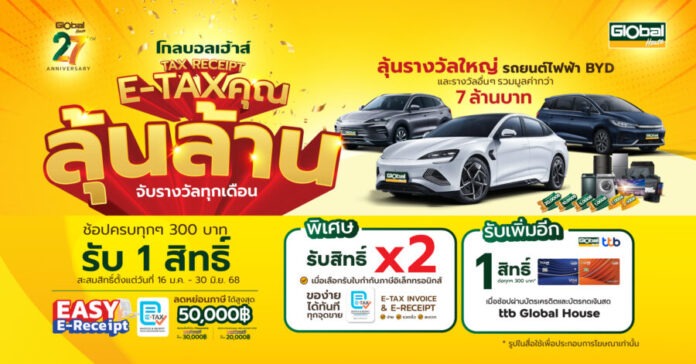 ช้อปสุดคุ้ม ลุ้นรางวัลใหญ่กับแคมเปญ “โกลบอลเฮ้าส์ TAX RECEIPT E-TAX คุณ ลุ้นล้าน” ที่มอบโอกาสให้คุณลุ้นเป็นเจ้าของรถยนต์ไฟฟ้าแบรนด์ดัง BYD พร้อมของรางวัลสุดพิเศษอีกมากมาย เช่น เครื่องใช้ไฟฟ้า เฟอร์นิเจอร์ คูปองแทนเงินสด และรางวัลอื่นๆ รวมมูลค่ากว่า 7 ล้านบาท* เริ่มสะสมสิทธิ์ได้ตั้งแต่วันที่ 16 มกราคม – 30 มิถุนายน พ.ศ. 2568 อย่าพลาดโอกาสดีๆ แบบนี้!