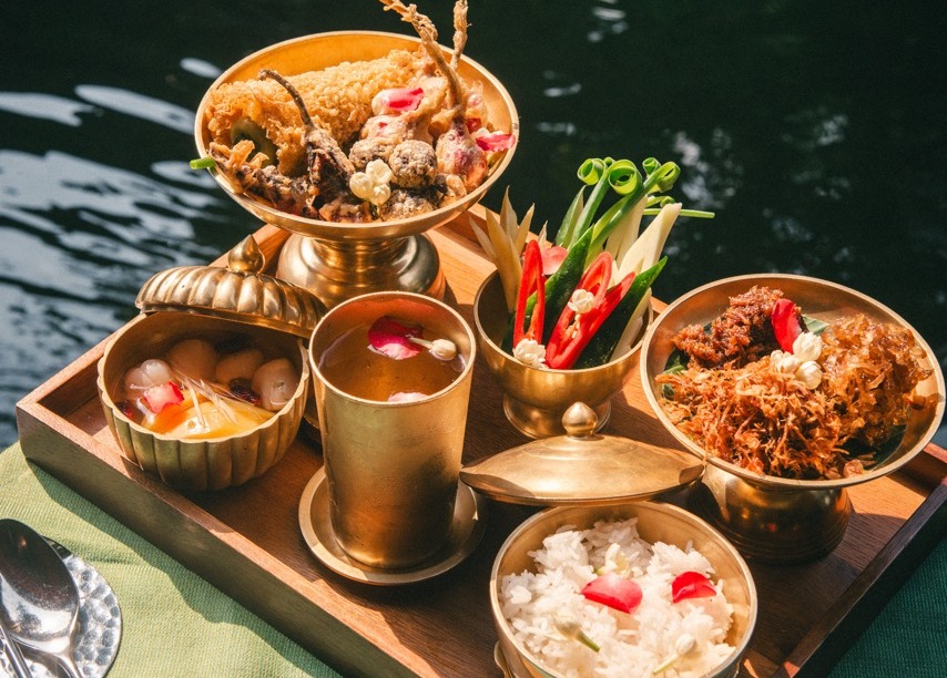 “ข้าวแช่ จิม ทอมป์สัน” นำเสนอข้าวหอมมะลิไทยที่นึ่งด้วยวิธีดั้งเดิม เสิร์ฟพร้อมน้ำลอยดอกไม้ออร์แกนิกในชามทองเหลืองอันงดงาม ข้าวแช่มาพร้อมเครื่องเคียง 7 ชนิด ได้แก่ ลูกกะปิชุบไข่ทอด ที่คั้นจากกะปิคุณภาพดีผสมสมุนไพรไทยหอมกรุ่น ไชโป๊วหวาน ทำจากหัวไชเท้าเชื่อมด้วยน้ำตาลมะพร้าวจนเคลือบเงาสวยงาม พริกหยวกสอดไส้ห่อไข่ลูกไม้ ยัดไส้หมูคุโรบุตะและกุ้งผสมสมุนไพร ห่อด้วยไข่ลูกไม้ออร์แกนิก ปลายัดไส้หอมแดง ใช้หอมแดงคัดพิเศษยัดไส้ปลาช่อนแดดเดียวปรุงรส หมูฝอย ทำจากเนื้อหมูฉีกปรุงด้วยน้ำตาลมะพร้าวท้องถิ่นและน้ำปลา พริกแห้งไส้ปลาหวาน พริกชี้ฟ้าแห้งยัดไส้ปลาแดดเดียวปรุงรสหวาน นำไปชุบแป้งทอดสีทอง และ ปลายี่สนหวาน ปรุงอย่างพิถีพิถันด้วยซอสหวานที่ดึงเนื้อสัมผัสนุ่มกำลังดีของปลาออกมาได้อย่างลงตัว นอกจากนี้ยังเสิร์ฟผักและผลไม้แกะสลัก อาทิ มะม่วงมัน แตงกวา กระชาย และพริกชี้ฟ้าสด ปิดท้ายด้วยของหวานซิกเนเจอร์อย่าง ส้มฉุนลูกหม่อนลิ้นจี่มะยงชิด เติมกลิ่นหอมด้วยผิวส้มซ่า ดอกมะลิออร์แกนิก พร้อมเติมความหวานสดชื่นด้วยไซรัปดอกไม้ออร์แกนิก