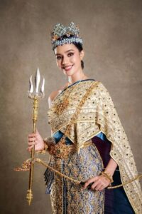 ตัวชุดรังสรรค์จาก “ผ้าไหมยกใหญ่ลำพูน” มรดกหัตถศิลป์ชั้นสูงของไทย ผสานสไบผ้าไหมปักลวดลายละเอียดด้วยเทคนิคขั้นสูง เสริมมิติด้วยสไบอัดกลีบในเฉดเดียวกับมงกุฎ เกิดเป็นความกลมกลืนระหว่างเครื่องแต่งกายและศิราภรณ์อย่างวิจิตรบรรจง ถ่ายทอดความสง่างามในระดับ Haute Couture ได้อย่างสมบูรณ์แบบ ผลงานการออกแบบโดย ดร.สรรค์ สุดเกตุ แห่ง Vanus Couture ผู้เชี่ยวชาญในการยกระดับ “ชุดไทย” สู่เวทีแฟชั่นโลก ทรงพาหุรัดทัดดอกบัวหลวง อันเป็นสัญลักษณ์แห่งความบริสุทธิ์ ความรุ่งเรือง และจิตวิญญาณแบบไทย พระหัตถ์ขวาทรงตรีศูล แทนพลังอำนาจและความแข็งแกร่ง พระหัตถ์ซ้ายทรงธนู สื่อถึงปัญญาและความแม่นยำ สะท้อนสมดุลระหว่างความอ่อนช้อยและพลังภายในได้อย่างงดงาม