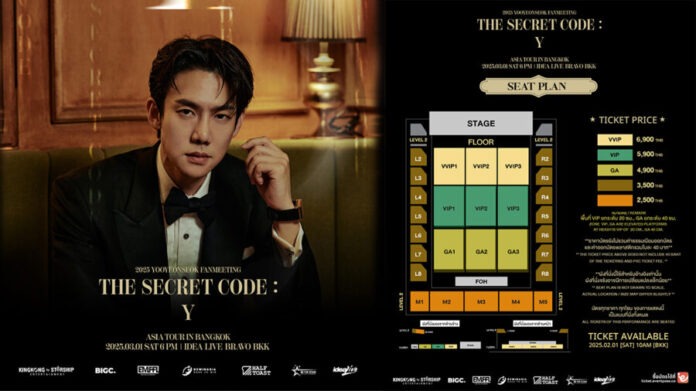 ล่าสุดกับความพิเศษที่พลาดไม่ได้ กับ 2025 YOO YEON SEOK FANMEETING “ The Secret Code : Y ” Asia Tour in Bangkok. แฟนๆ ชาวไทยเตรียมตัวให้พร้อม มาร่วมกันไขรหัสลับกับยูยอนซอก ในบรรยากาศสุดใกล้ชิด เต็มอิ่มกับโมเมนต์แห่งความสุขสุดประทับใจกว่าครั้งไหน และเซอร์ไพรส์ที่ยูยอนซอกเตรียมมาฝากแฟนๆ ที่เมืองไทยโดยเฉพาะ งานนี้ทางผู้จัดยังมีกิจกรรมสุด Exclusive พร้อม Benefits จัดเต็มอีกด้วย ราคาบัตร 6,900 / 5,900 / 4,900 / 3,500 / 2,500 บาท เปิดขาย 1 กุมภาพันธ์ 2568 ตั้งแต่เวลา 10.00 น. ซื้อบัตรได้ที่ Eventpass https://ticket.eventpass.co/t/TheSecretCode_Y