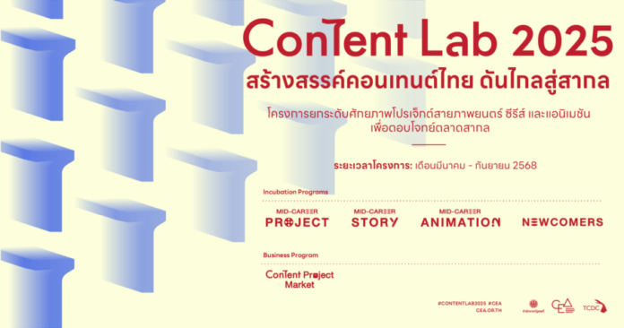 ติดตามรายละเอียดเพิ่มเติมโครงการ Content Lab 2025 ได้ที่เพจ Content Lab รวมถึงกิจกรรมอื่น ๆ ของ CEA ได้ที่เว็บไซต์ www.cea.or.th