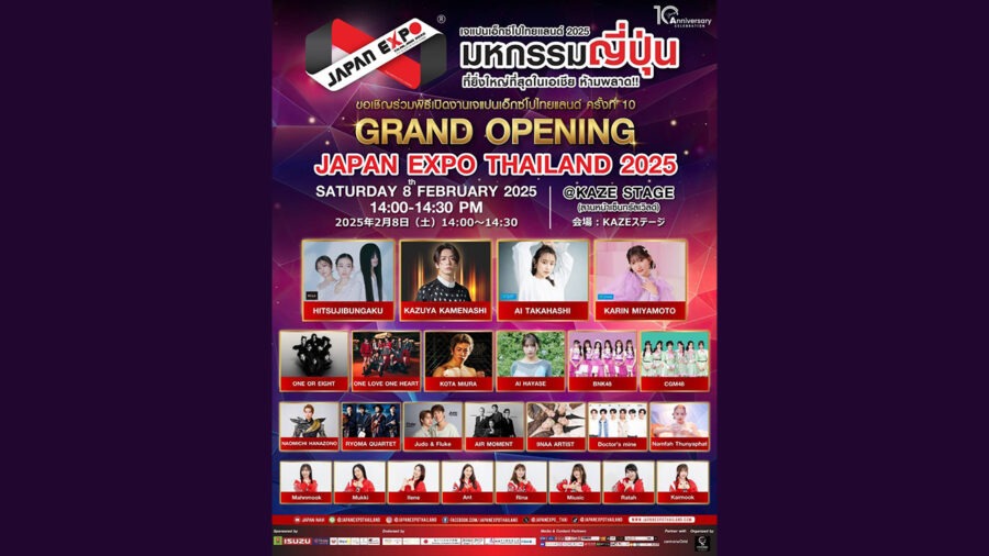 เตรียมนับถอยหลังกันแล้ว!!! สำหรับงานมหกรรมญี่ปุ่นที่ยิ่งใหญ่ที่สุดในเอเชีย JAPAN EXPO THAILAND 2025 ฉลองครบรอบปีที่ 10 อย่างยิ่งใหญ่ในธีม Celebrate 10th Anniversary จัดโดย บริษัท จี–ยู ครีเอทีฟ จำกัด บริษัทฯ จัดงานอีเว้นท์ญี่ปุ่นที่ยิ่งใหญ่ที่สุดในระดับเอเชีย พร้อมด้วยเหล่าพันธมิตรทั้งภาครัฐและเอกชน อาทิ โออิชิ, บริษัท ตรีเพชรอีซูซุเซลส์ จํากัด, บริษัท การบินไทย จำกัด (มหาชน), การท่องเที่ยวแห่งประเทศไทย, Thailand Privilege, สถานเอกอัครราชทูตญี่ปุ่นประจำประเทศไทย, เจแปนฟาวด์เดชั่น, องค์การส่งเสริมการท่องเที่ยวแห่งประเทศญี่ปุ่น (JNTO), องค์การส่งเสริมการค้าต่างประเทศของญี่ปุ่น (JETRO), สมาคมญี่ปุ่นในประเทศไทย Japanese Association in Thailand และ CEA (Creative Economy Agency) หรือ สำนักงานส่งเสริมเศรษฐกิจส้างสรรค์ (องค์การมหาชน) ผนึกกำลังจัดงานอีเว้นท์ญี่ปุ่นที่ใหญ่ที่สุดในเอเชีย ในระหว่างวันศุกร์ที่ 7 – วันอาทิตย์ที่ 9 กุมภาพันธ์ 2568 ตั้งแต่ 10.00-21.00 น. ณ ศูนย์การค้าเซ็นทรัลเวิลด์